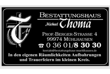 Bei Bestattungshaus Thomä sind Sie richtig! Bestattungshaus Thomä aus Mühlhausen ist der Anbieter Ihres Vertrauens. Weitere Informationen über unser Leistungsangebot erfahren Sie gerne in einem persönlichen Kontakt. Bestattungshaus Thomä aus Mühlhausen berät Sie gerne.